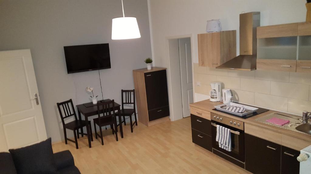 Für zusätzlichen Komfort besitzen die Zimmer eine kleine, praktische Küchenzeile mit Esstisch. Diese ist ausgestattet mit Kaffeemaschine, Toaster, Herd, Wasserkocher, Kühlschrank und allen wichtigen Küchenutensilien. So können Gäste auch längere Aufenthalte bequem gestalten und sich flexibel selbst verpflegen. Zur weiteren Ausstattung gehören ein Schrank, ein Schreibtisch mit Sitzgelegenheit sowie ein Kleiderständer. Ein moderner Flachbild-TV und kostenfreies WLAN stehen ebenfalls zur Verfügung. Die privaten, kleinen Bäder verfügen über Dusche, WC, Fön und Handtücher. Die Kombination aus zweckmäßiger Ausstattung und gemütlicher Einrichtung macht die Pension zu einer attraktiven Wahl für preisbewusste Reisende.